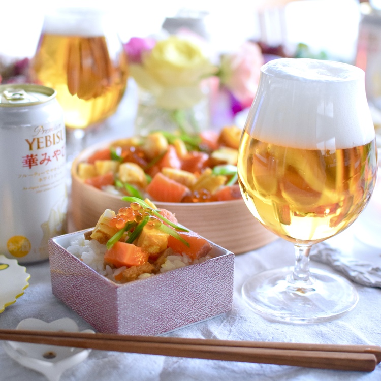 @nao_cafeさんは、「ヱビス 華みやび」の華やかな香りを楽しむために、ビアグラスではなくチューリップグラスを用意。洗練された味わいの華やかなビールと一緒に楽しんだのは、ごろごろ具材が豪華なばらちらし。スペシャルなビールには、スペシャルなご飯を合わせて過ごされていました。