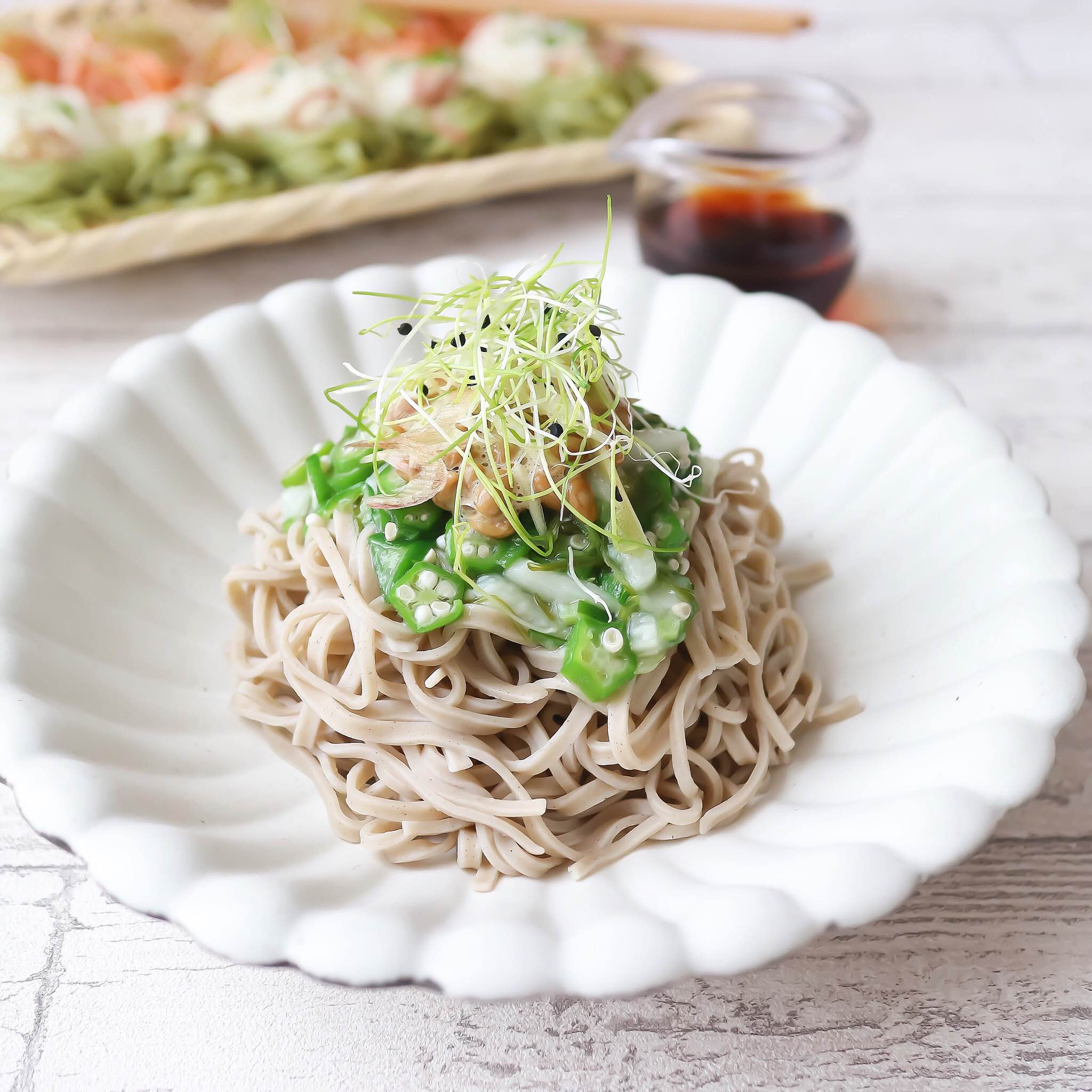 おくら・山芋・めかぶ・納豆のねばねば4種をのせて、つるつるっといただきましょう!
