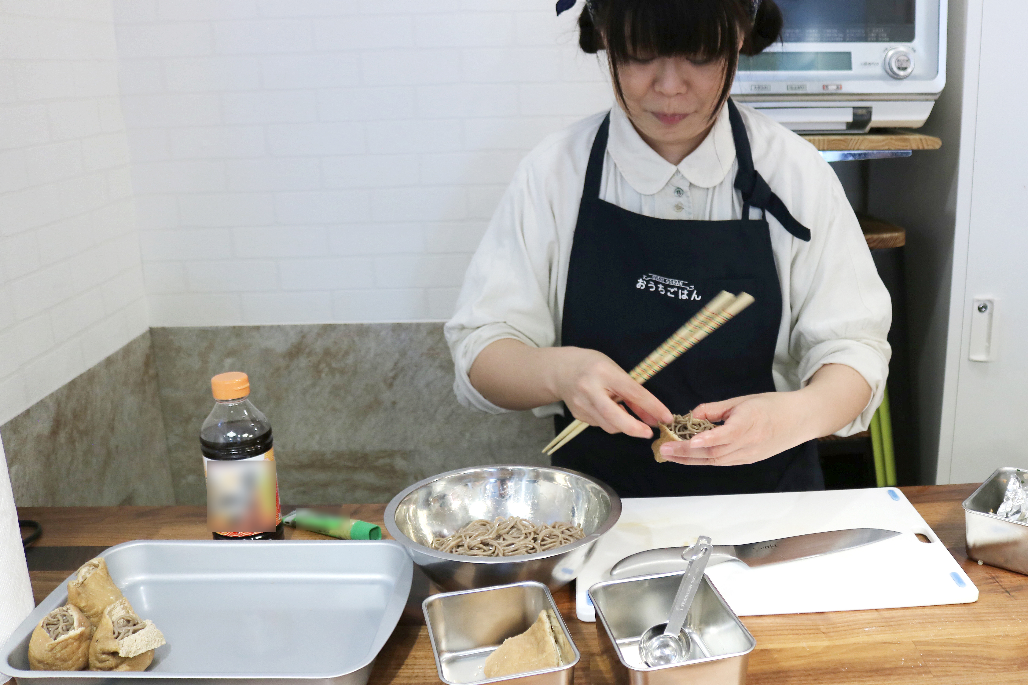 「そば稲荷」が生まれたきっかけを伺ったところ、「まちゃまちゃがそばの海苔巻きを作っていたのがおいしかったんですよ。だったら稲荷もいけるよねって」とのこと。片手でパクッと食べられるので、お弁当にぴったりですよね。油揚げを煮る時間があまりない時は、裏返して煮るといいそう。