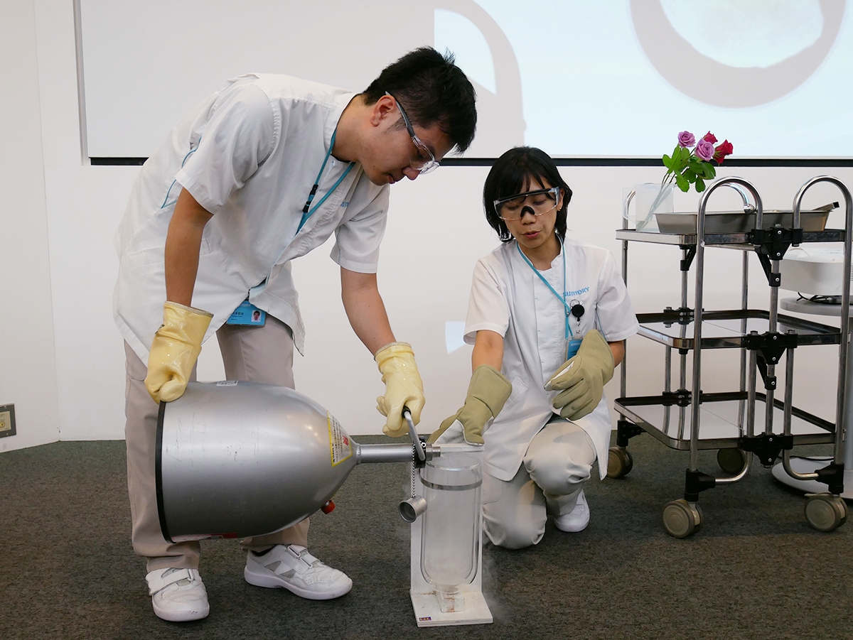 まずは液体窒素を容器に移すところから。透明な液体を少しずつ注ぎ入れていくとたちまち白い煙がモクモクとあがり、ひんやりとした空気が流れてきました。