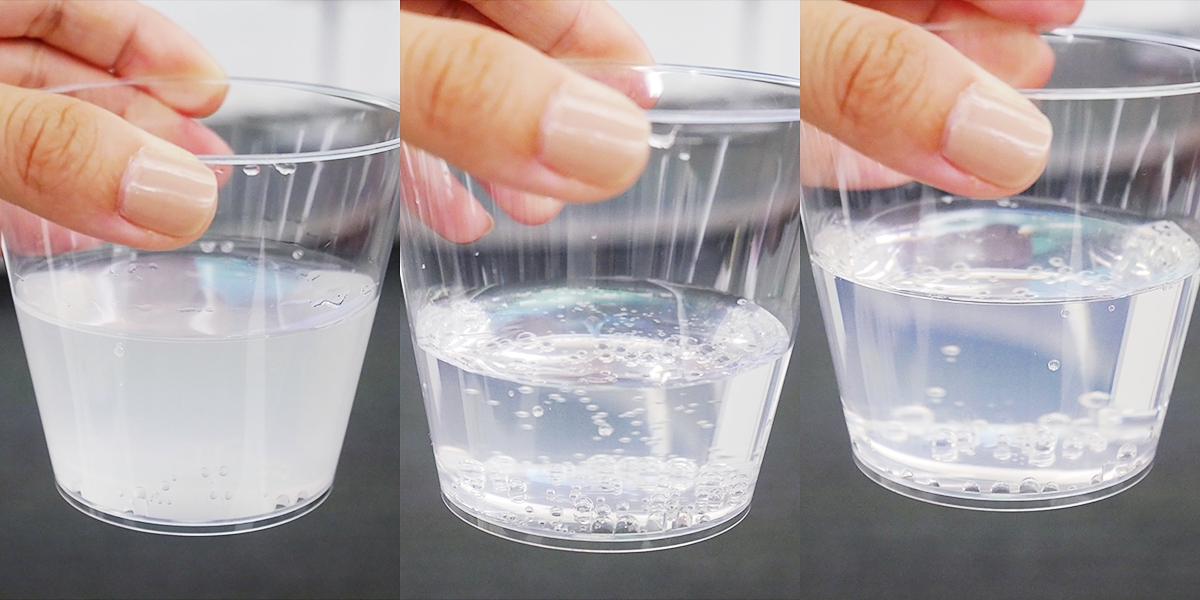 ちなみに、レモンを冷凍庫に入れておくと果汁は凍るものの、表面のオイル成分は凍らないのだとか。オイル成分は-70℃で固まるのですが、まだバターのようにふにゃふにゃな状態。それを-196℃で瞬間凍結させると全ての分子運動が停止するので、果実を皮から丸ごと粉砕することができるんですね。