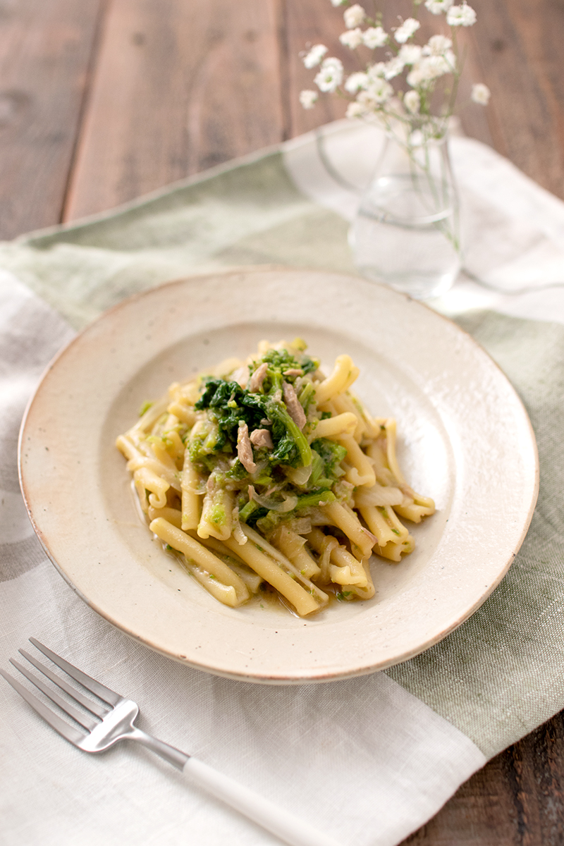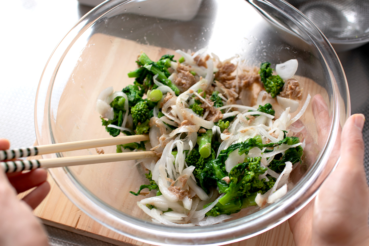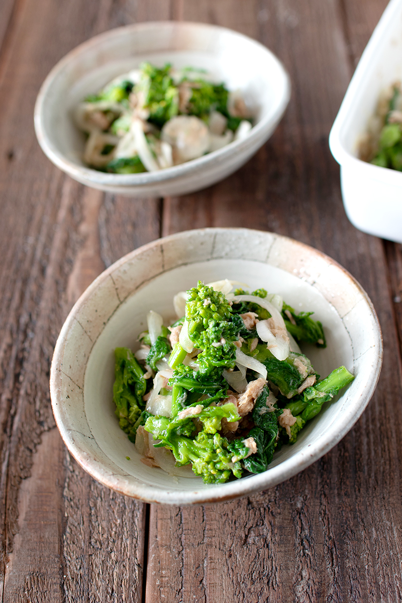 菜の花と新玉ねぎをツナとからしで和えて。ほんのりピリ辛がアクセント!
