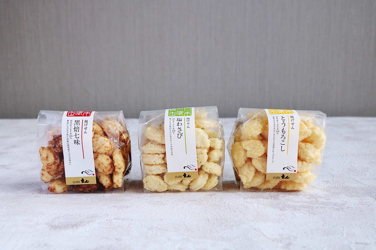 和菓子と言っても、せんべいや揚げせんなど、甘くないお菓子ばかり! 和食のおいしさをお菓子でも表現しようという、えんのこだわりとチャレンジ精神が詰まったお菓子なんです。