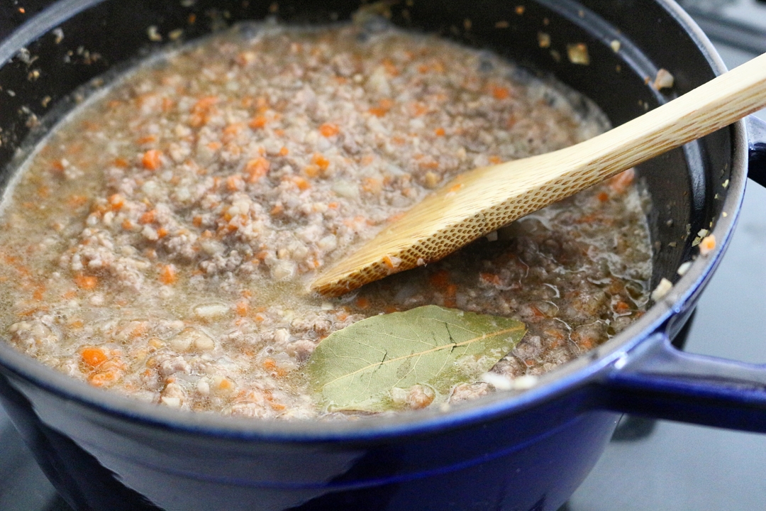 3. 2に水とローリエを加え沸騰させ灰汁をとり、蓋をして10分ほど煮込む。