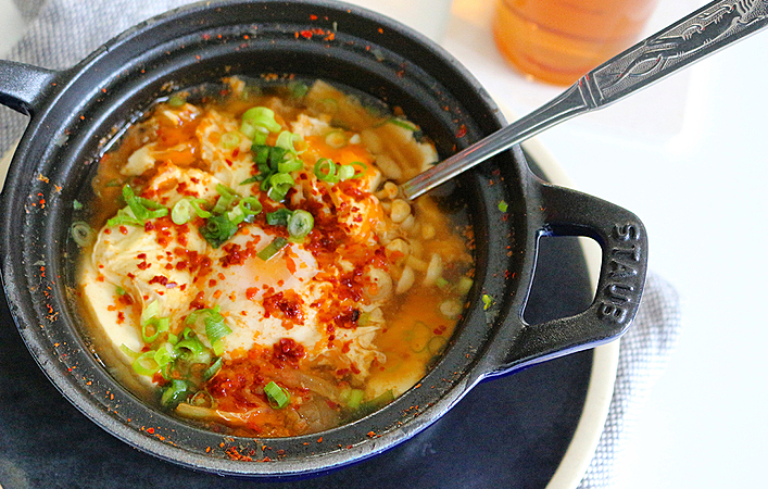2. 1に豆腐を崩しながら加え、再度煮立ったらえのきと玉子を入れる。