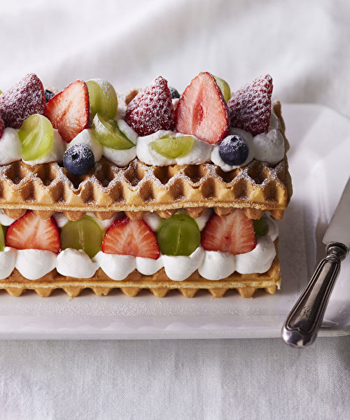 サイズが大きいダブルなら、生クリームやフルーツを重ねてケーキ風にしてもとってもおしゃれ! 一度に大きいワッフルが焼けるから、カットしてみんなでシェアしても◎。