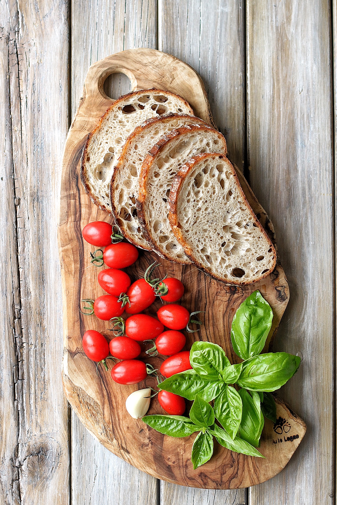 1. パンを1.5cmほどの厚さに4枚スライスする。1枚ごとに大さじ1のエキストラ・ヴァージン・オリーブオイルをかけて片面に焦げ目が付くまでフライパンで焼く。裏面はさっと焼くだけでよい。