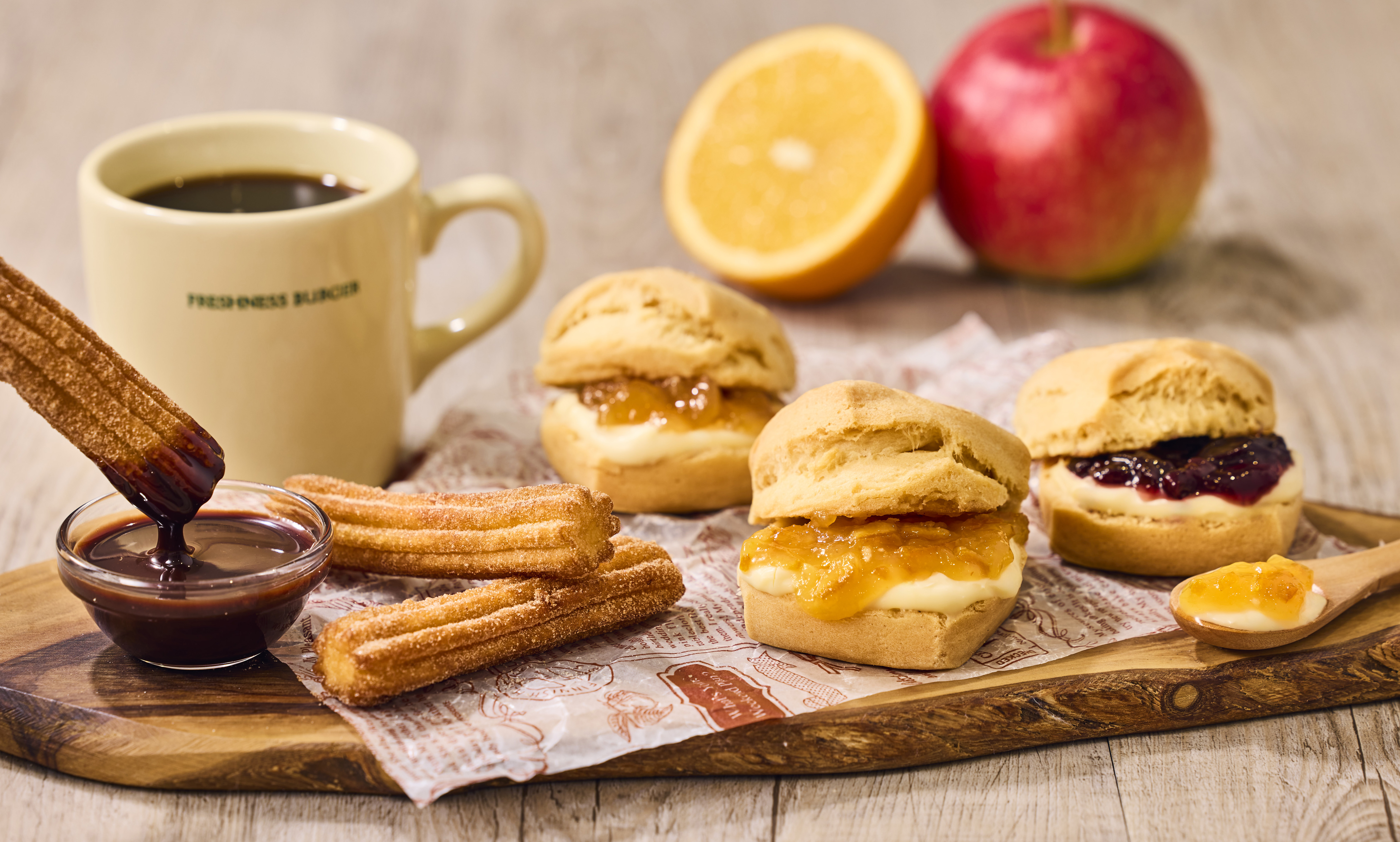 マーマレード、ブラックチェリー、アップルシナモンの3種の味わいが楽しめる、フレッシュネスバーガーのスコーンサンド。外はふんわり、中はしっとり、作りたてのおいしさをお店でぜひ。