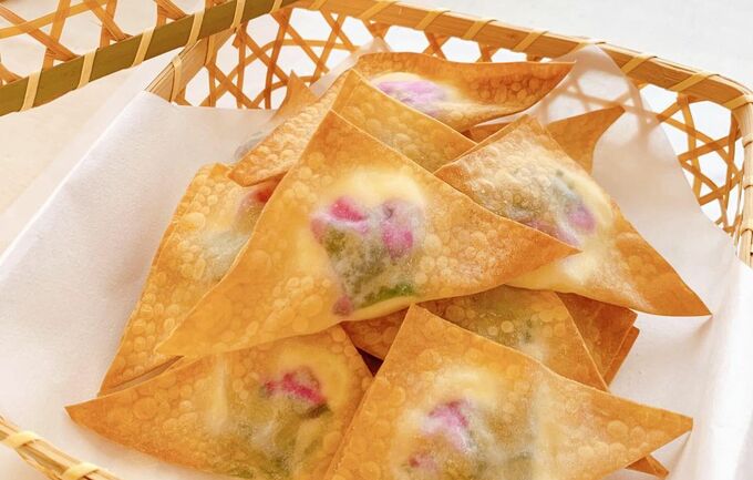 まるで桜を彷彿とさせる色合いのクリームチーズと柴漬けの焼きワンタンも、先ほどご紹介した@___santababy___さんのレシピ。