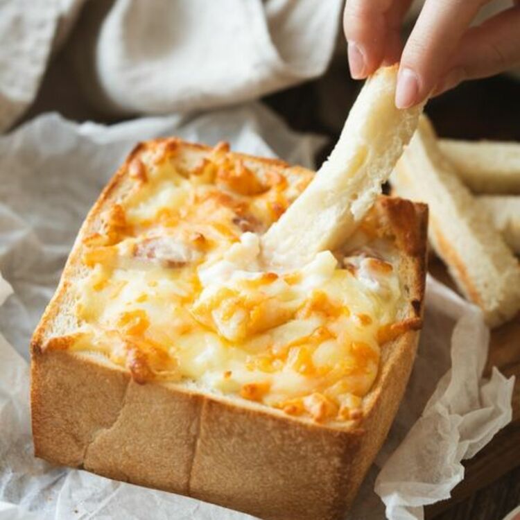 見ているだけでわくわくするような、憧れがいっぱい詰まったパングラタン。くりぬいた中身をスティック状にカットして、あつあつのグラタンをつけて召し上がれ。