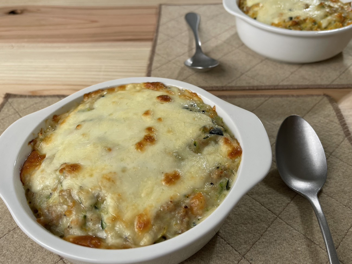 6. 耐熱皿に、油小さじ1(分量外)を塗り、ごはんを敷き、5をかけてチーズをのせ、トースター(1000W)で焼き色がつくまで焼く。