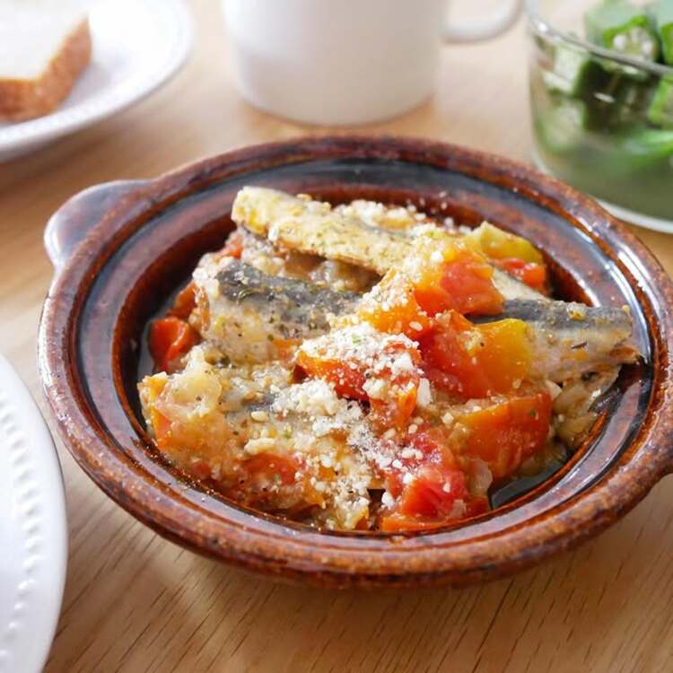 圧力鍋で骨までやわらかく仕上げた、いわしと完熟トマトの煮込み。