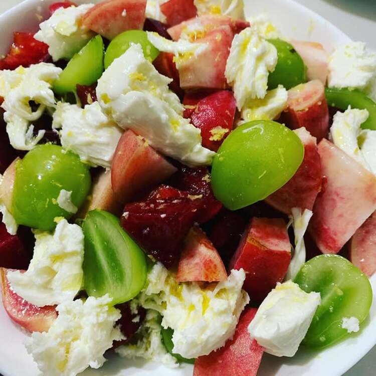 シャインマスカット、桃、すももなど旬のフルーツにモッツァレラチーズを合わせて。
