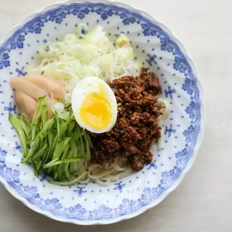 ひき肉をベースに作る肉味噌を、コシのある平打ち麺に合わせるのが盛岡ジャジャ麺の基本。そこにきゅうりやゆで卵など、お好みの具をトッピングして豪快に混ぜていただきます。
