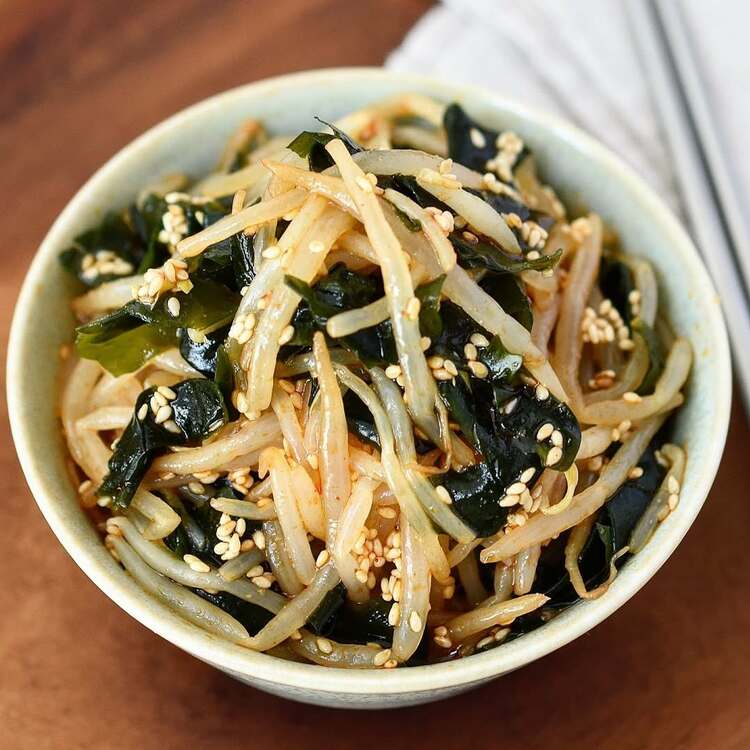 もやしをレンジで加熱して水で戻したワカメと和えるだけで、やみつきナムルが完成します。栄養を流さないために、乾燥ワカメは戻したらすぐにザルにあげるのがポイントです。