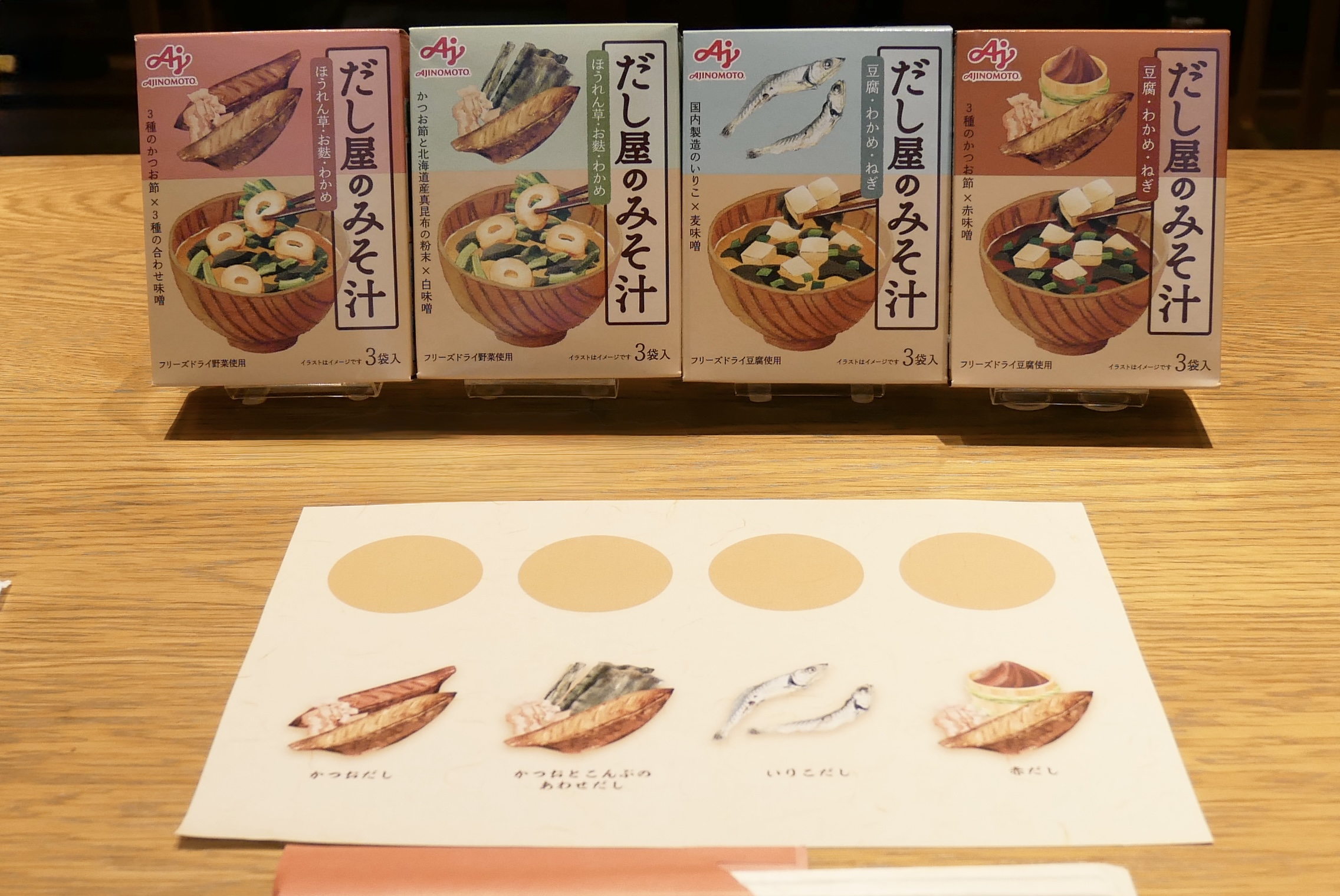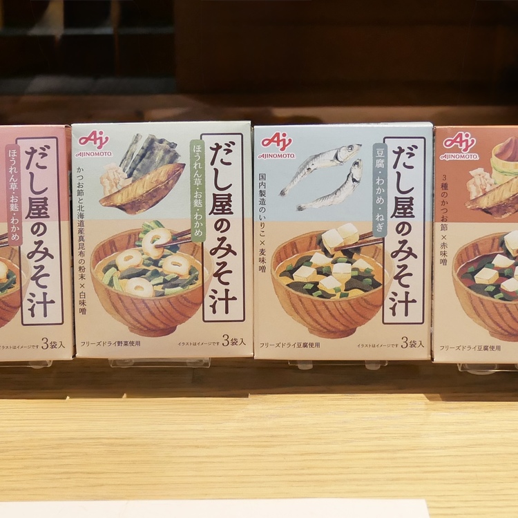 「だし屋のみそ汁」は、<かつおだし><かつおとこんぶのあわせだし><いりこだし><赤だし>の全部で4種類。みそ汁は全国の地域によって使用されるみそが違い、味わいが変わるため、それに合わせて4種類が開発されたのだそうです。
