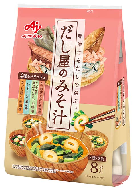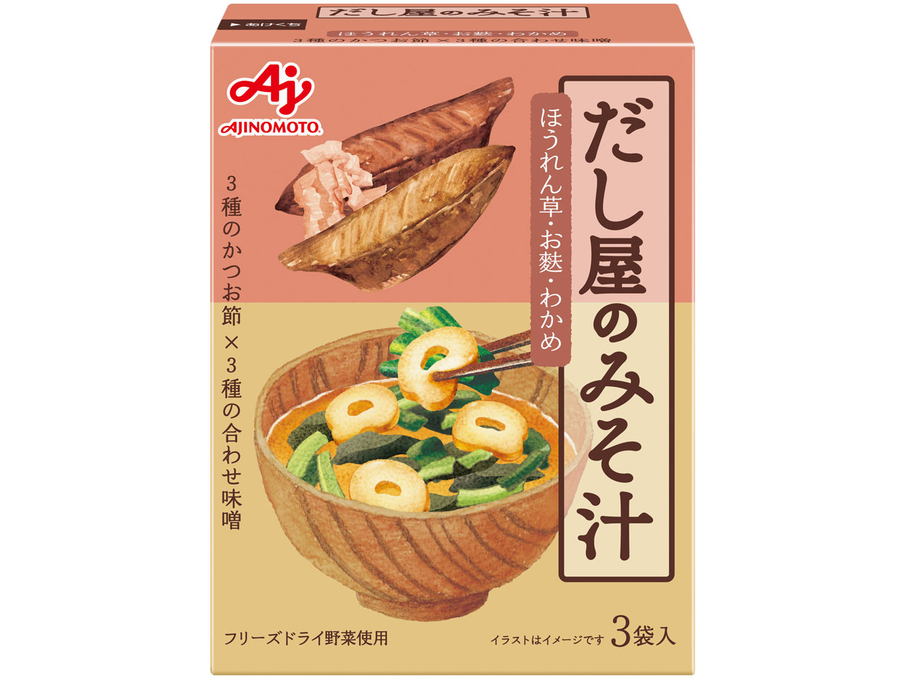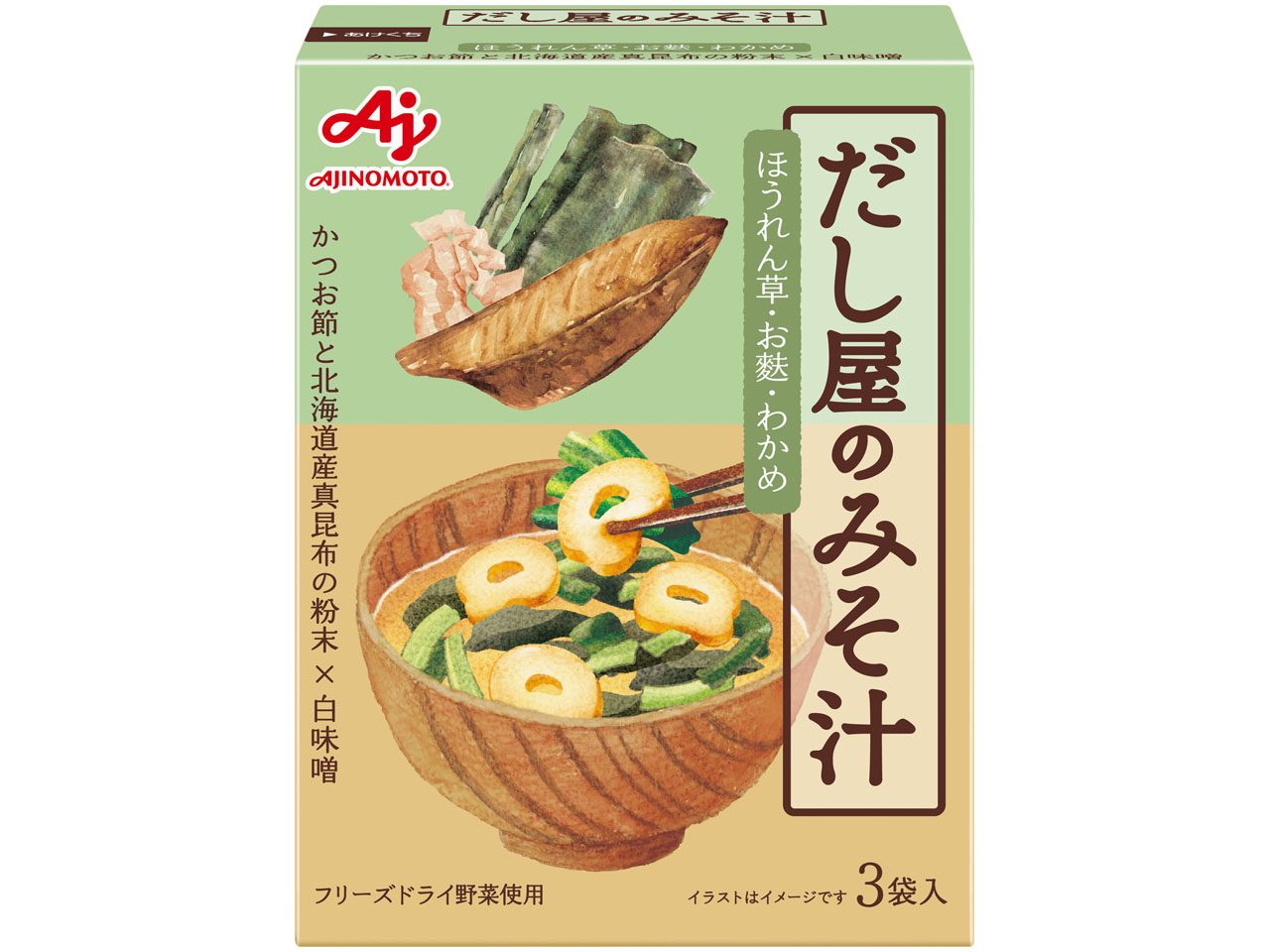 味の素が今回新発売した「だし屋のみそ汁」は、長年の「ほんだし®︎」で培ってきた独自の素材や技術を活かして「だし」と相性の良い味噌や具材を最適なバランスで配合。お湯を注ぐだけでできる即席ながら、だしに本格的にこだわったみそ汁が楽しめちゃうんです。