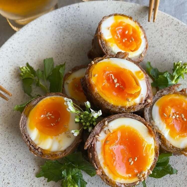 ジューシーな肉ダネと半熟卵がベストマッチです。半熟卵は余熱で火が入ってしまうので、揚げたてをいただくのがおすすめ。子どもから大人まで喜ぶご馳走おかずです。