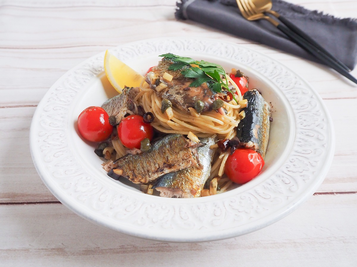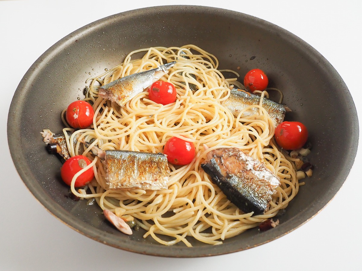 3. フライパンにAを加えて中火で熱し、にんにくの香りが立ったらミニトマトとケッパーを加えてさっと炒める。パスタの茹で汁、塩、こしょう、和風だしの素、パスタを加えて全体に絡める。1の秋刀魚を加えて全体をやさしく和える。