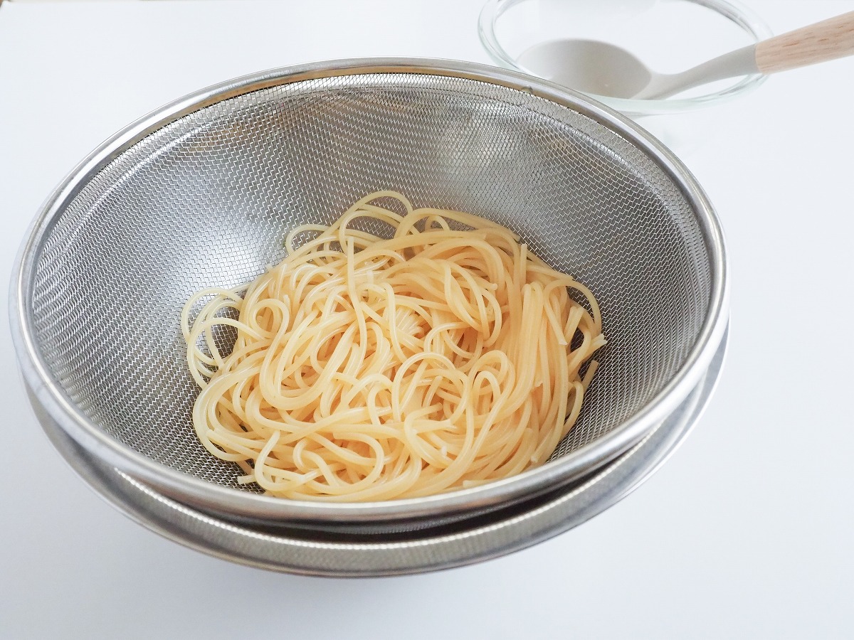 2. 鍋に湯を沸かして塩を加え、表記より1分短くパスタを茹でる。茹で汁はお玉1杯分取っておく。