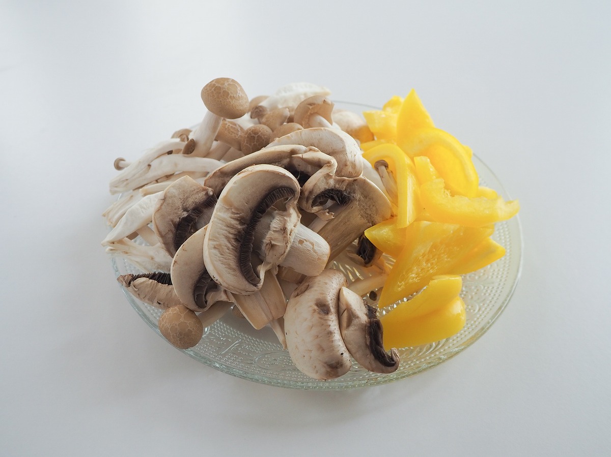 1. きのこは食べやすい大きさに切り、黄パプリカは乱切りにする。