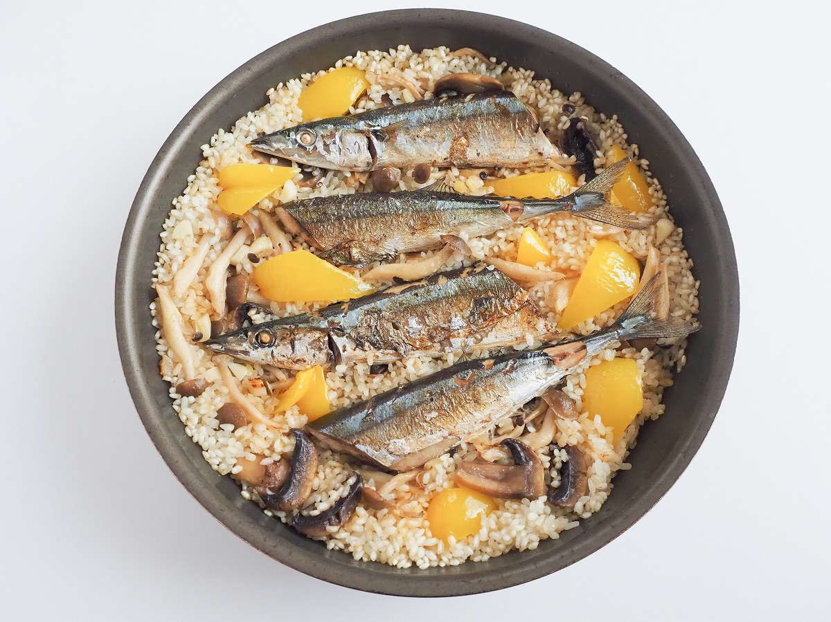 3. 同じフライパンにきのこ、米、にんにく、オリーブオイルを加えて中火で炒める。きのこがしんなりしてきたら、Aを加えて全体を混ぜる。秋刀魚と黄パプリカを加えて蓋をし、20分極弱火で加熱する。蓋を取り、強火で水気を飛ばす。
