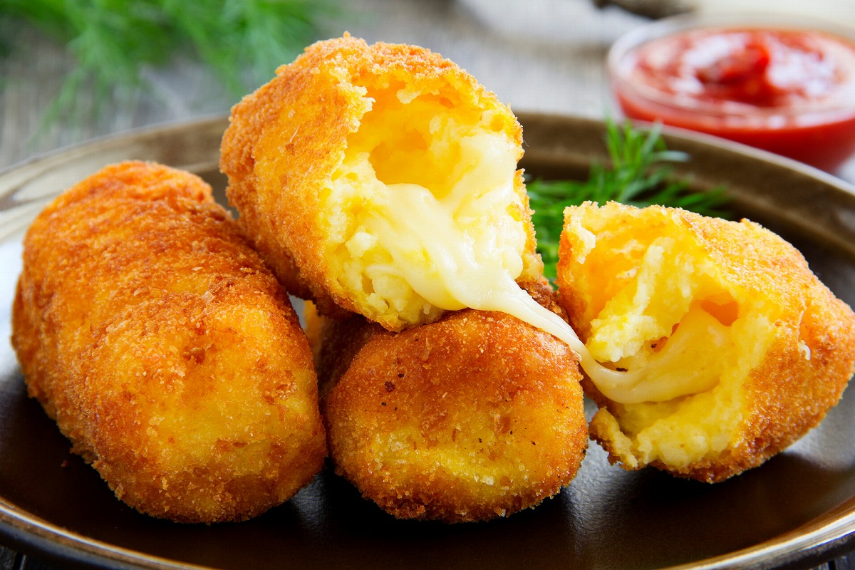 なめらかなマッシュポテトでカマンベールチーズを包み、衣をつけて揚げた贅沢コロッケ。