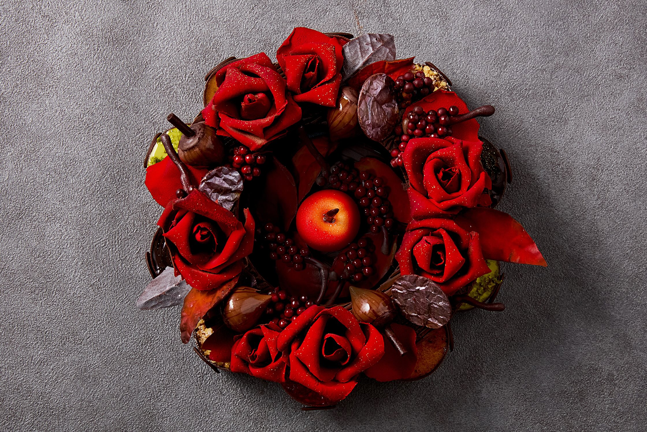 「クロンヌ・ド・ノエル」は限定10台、クリスマスリースに見立てた新作ケーキです。チョコレートでできたリース部分の下にはキャンドルに見立てた生ケーキ5種が各2個セットにして並べられており、10個のケーキをシェアして食べることができます。