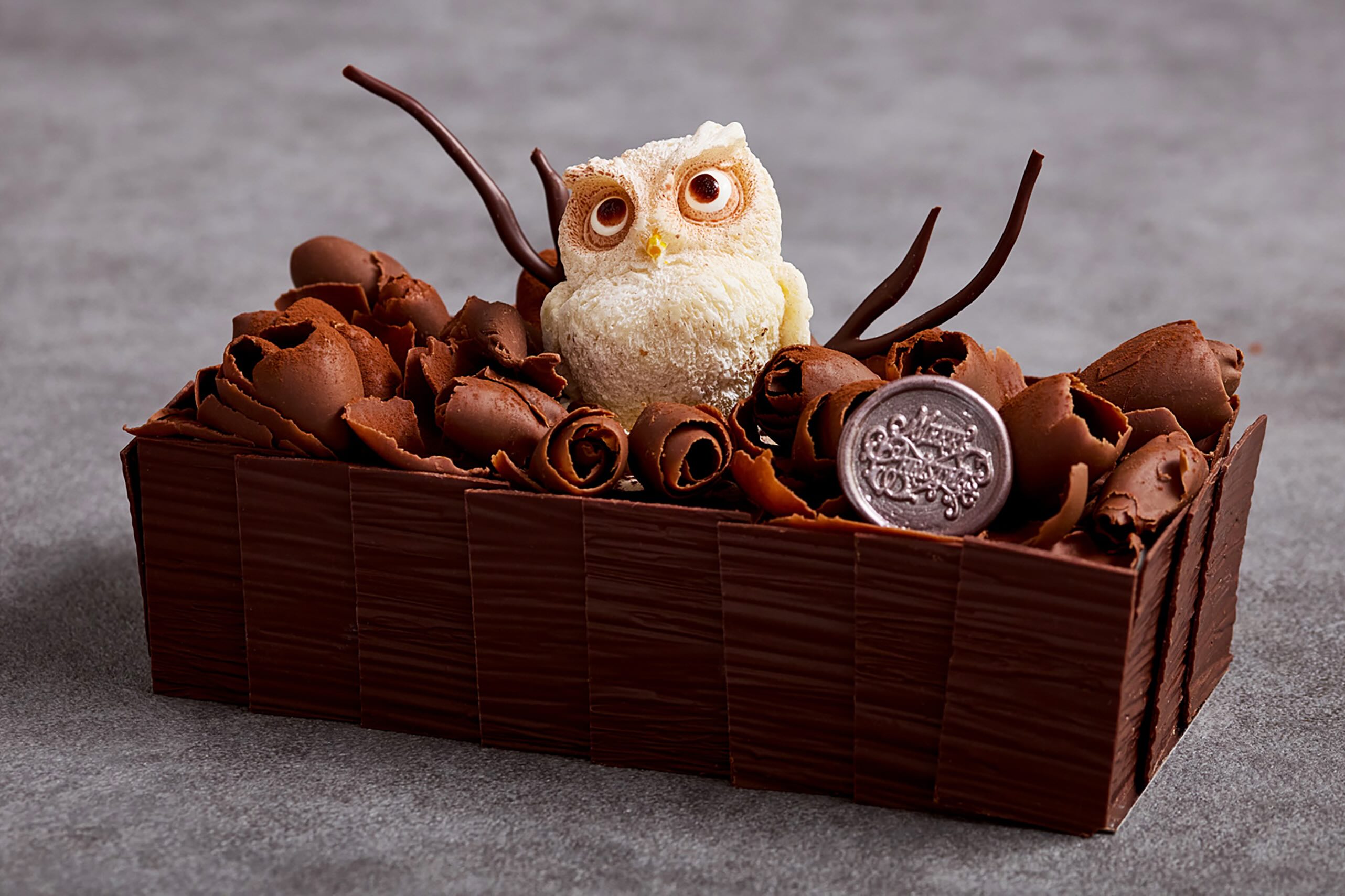 冬の静かな森に佇む白ふくろうがかわいらしい「ブッシュ・ド・ノエル」も数量限定。暖をとる木の葉に見立てて敷き詰められたジャンドゥージャの下には、オレンジピールのほろ苦さがアクセントになった濃厚なテリーヌショコラと、キルシュ香るフォレノワールの2つのハイカカオチョコレートケーキが隠れています。※アルコール入り