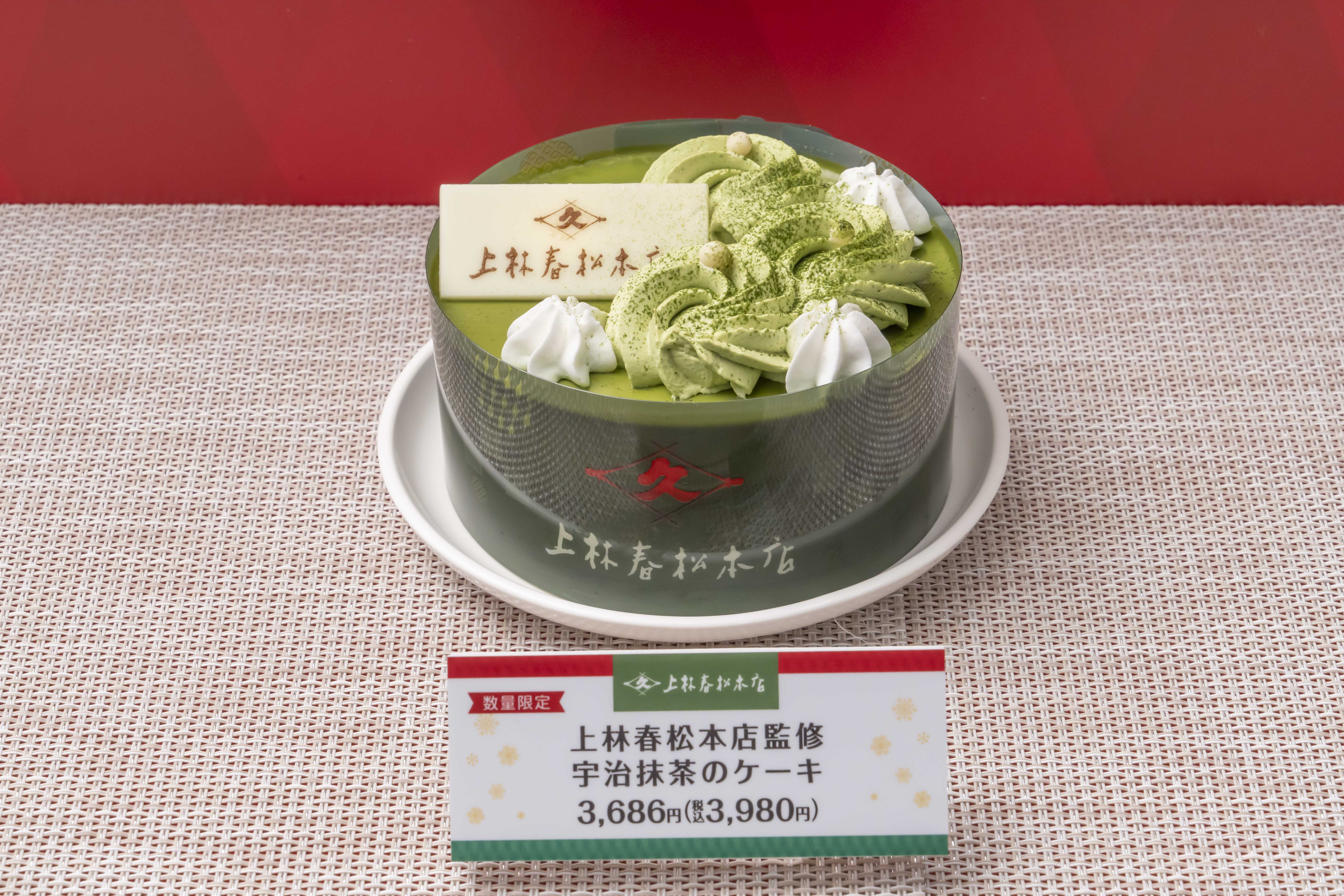 上林春松本店監修「宇治抹茶のケーキ」は、上林春松本店の宇治抹茶を使用した抹茶ムースとほろ苦い抹茶チョコソースのケーキです。別添の抹茶粉末付きです。