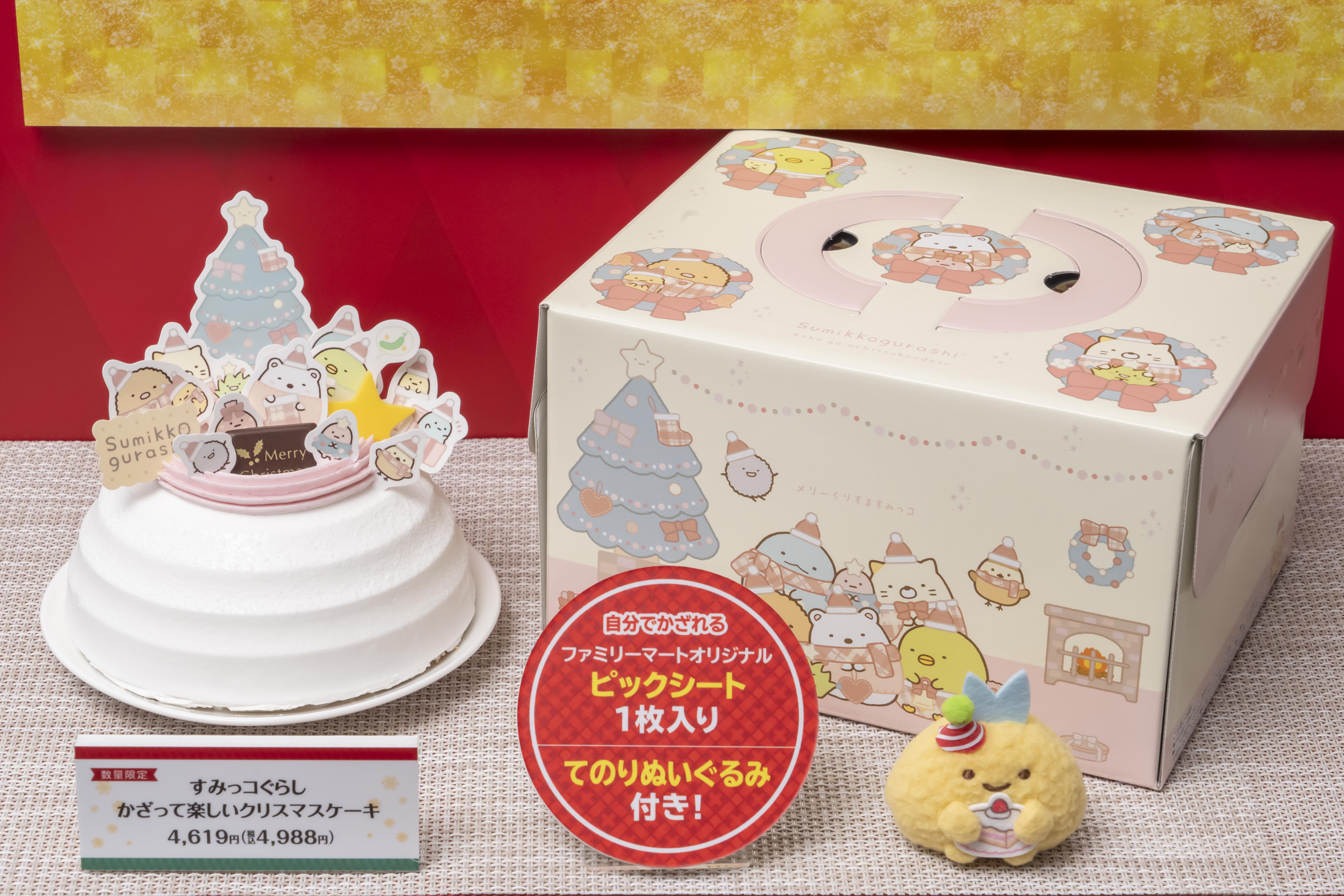 「すみっコぐらしかざって楽しいクリスマスケーキ」はふんわりとしたスポンジに、いちごジャムといちご風味クリームをサンド。ファミリーマートオリジナル「てのりぬいぐるみ」、自分で飾れる「ピックシート」が付いています。もちろんボックスもすみっコぐらしのデザイン!
