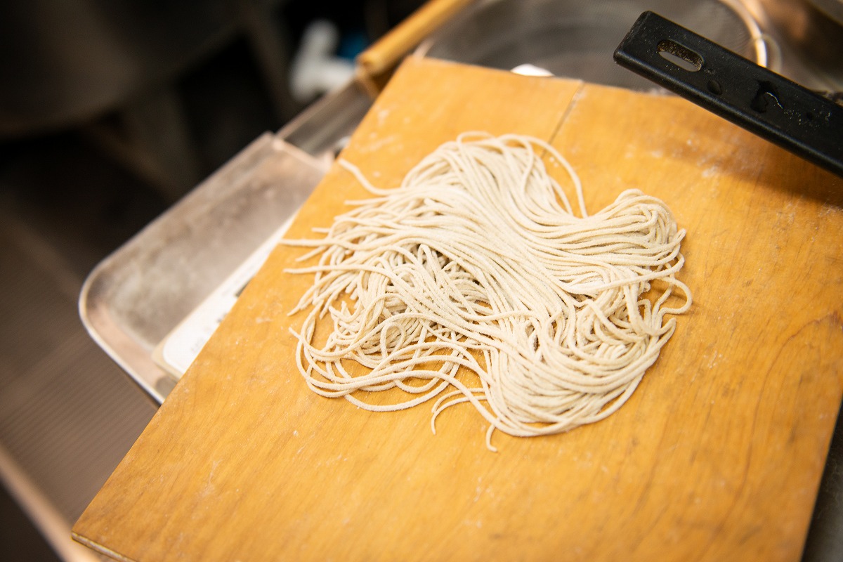 ▲蕎麦の実は修業時代に食べ比べた結果、長野県黒姫産と新潟県塩沢産を使用。細めの十割蕎麦は、香り、風味、喉ごしのバランスが見事!