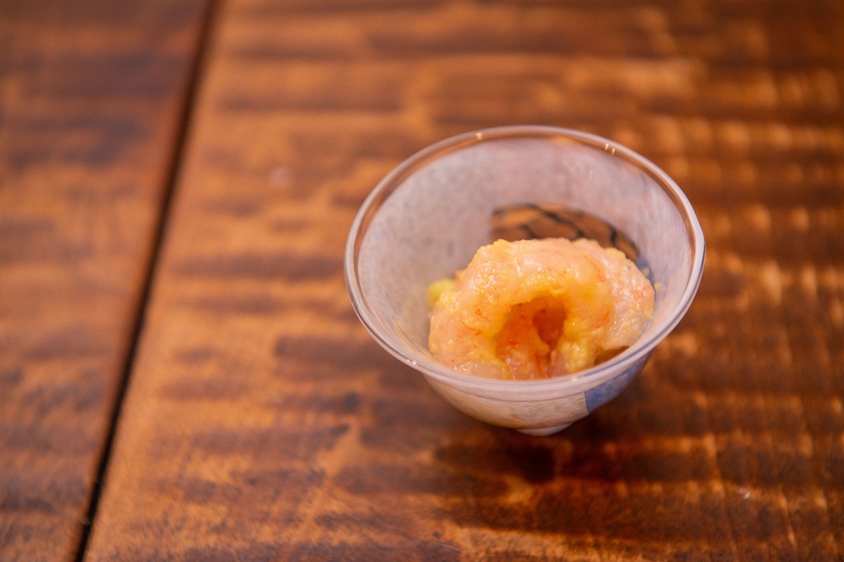 ▲昆布締めした甘海老を塩、わさび、太白ごま油と和えた「甘海老のわさびオイル和え」はコース料理のみで味わえる逸品