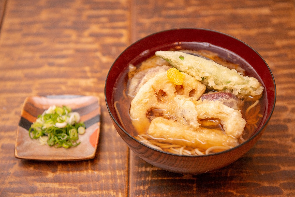▲冬季限定(11~2月まで提供予定)の「旬の野菜天ぷら蕎麦」(2,200円)。蕎麦の上に6~7種類の野菜天がのり、この日はれんこん、なす、さつまいも、紫玉ねぎ、ごぼう、オクラ。揚げたてのサクッとした天ぷらにつゆが染み入るのを楽しみながら味わいたい