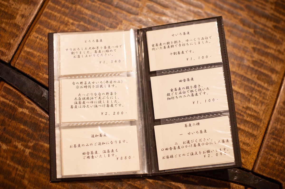新潟県塩沢産と長野県黒姫産の蕎麦の実をゆっくりと石臼で挽いた、こだわりの手打ち蕎麦が楽しめる名店。「せいろ蕎麦」(1,100円)は十割、「田舎せいろ」(1,100円)は二八の割で打つ。蕎麦前やお酒も充実していて、コース料理(昼は6,600円~、夜は7,700円~/要予約)もある。