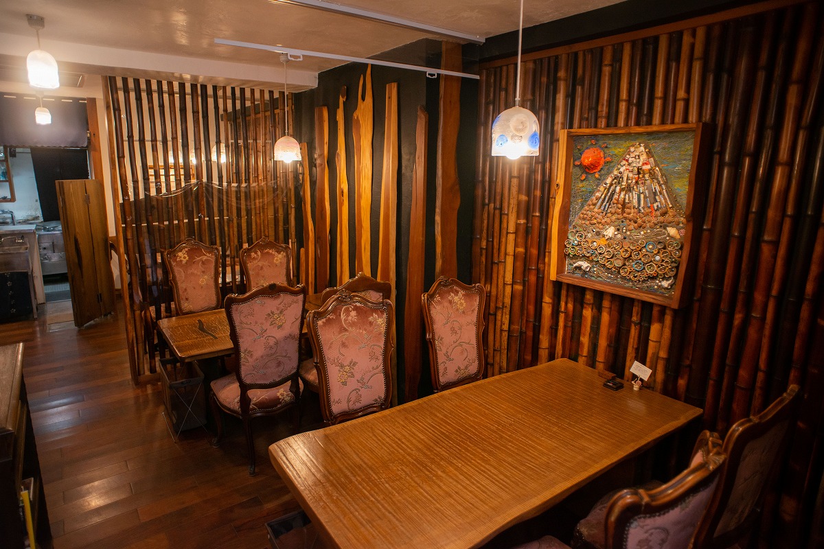 ▲店内は、竹や木を使った温かみのある内装で落ち着いた雰囲気。西洋アンティークの椅子などの調度品も素敵