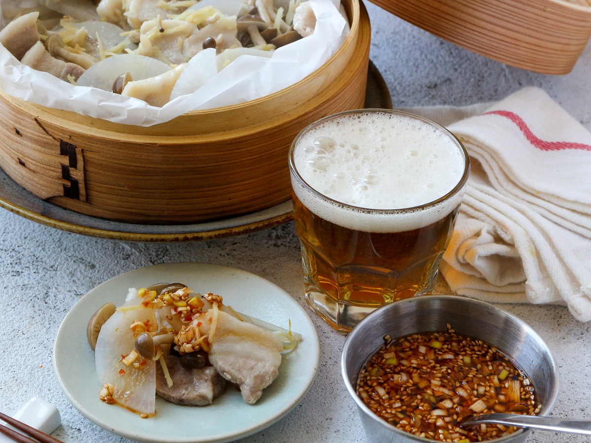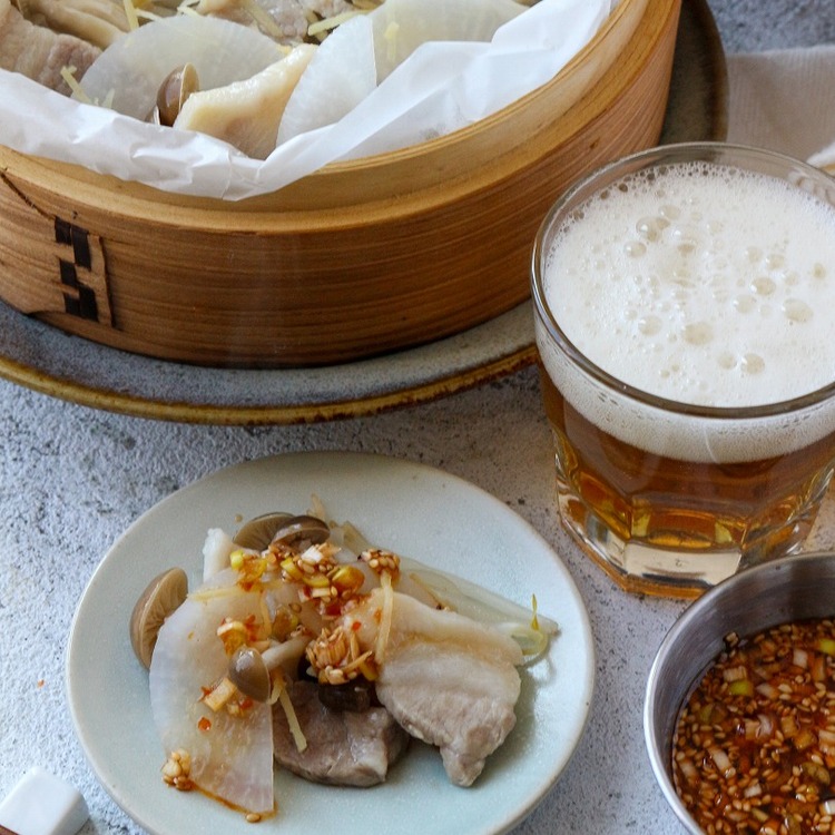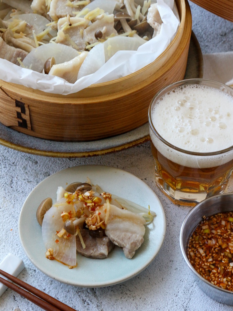 さて、今回の『おさけじかん』は寒くなってきたということで、温かい「豚バラと鍋野菜の中華風蒸籠蒸し」をビールに合わせてご紹介させていただきます。