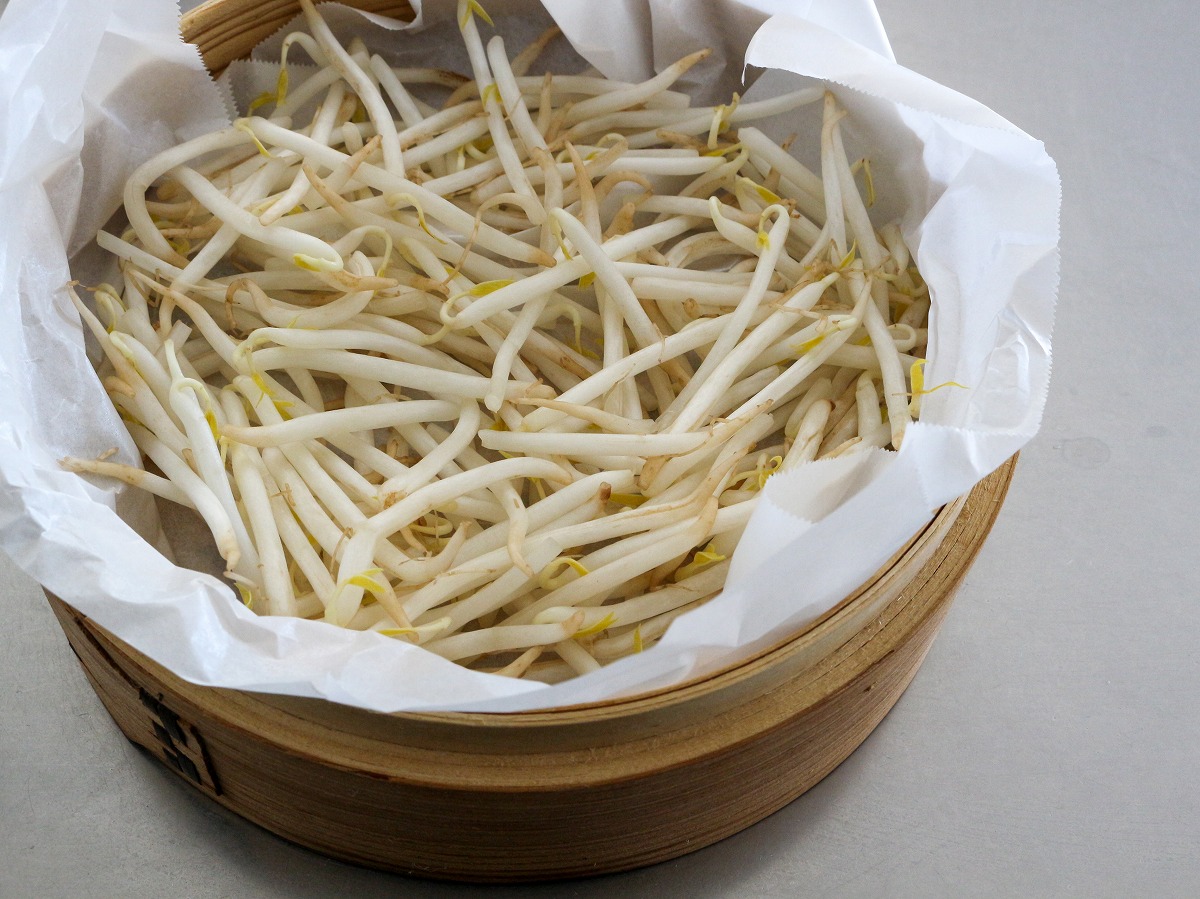 2. 蒸籠にクッキングペーパーを敷き、もやしをのせる。