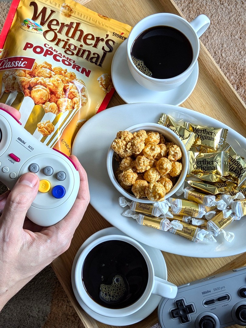 この日は、ゲームのお供に「ヴェルタースオリジナル」のキャラメル、キャラメルキャンディ、キャラメルポップコーンを選んでいます。オーバル型のお皿にカップを重ねて盛り付ければ、食べやすさも見栄えも抜群です。