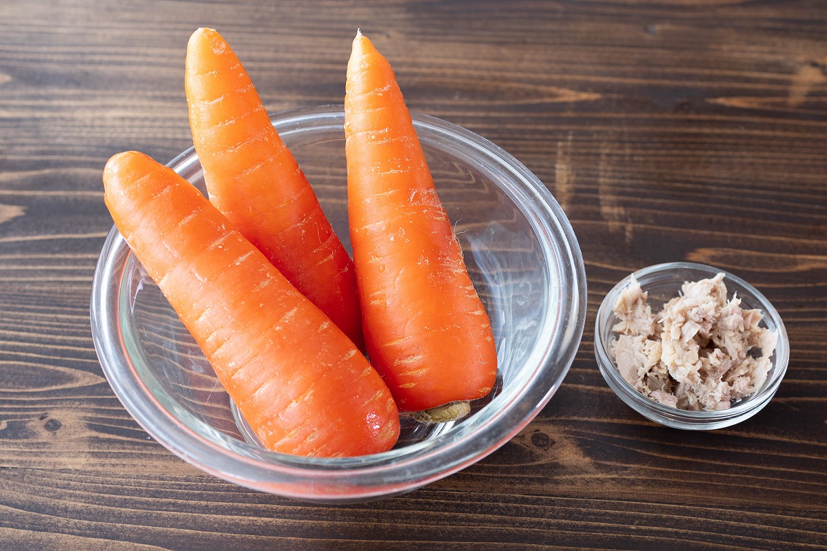 にんじんを電子レンジで丸ごと加熱してフォークで潰すだけ! ツナとごまのコク、粉チーズのまろやかさが合わさって、子どもから大人まで食べやすいお手軽万能サラダです。