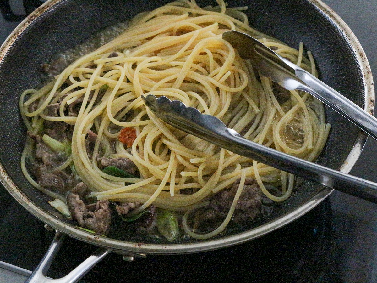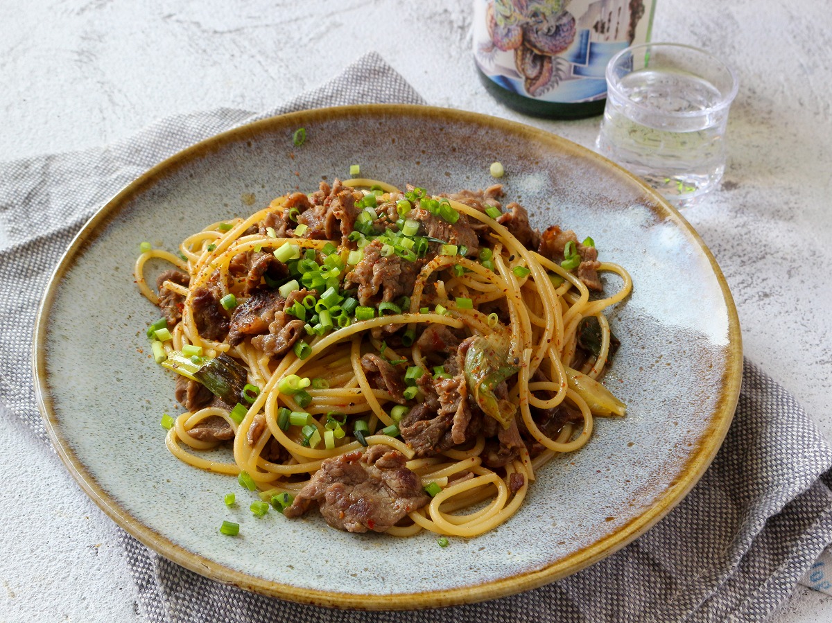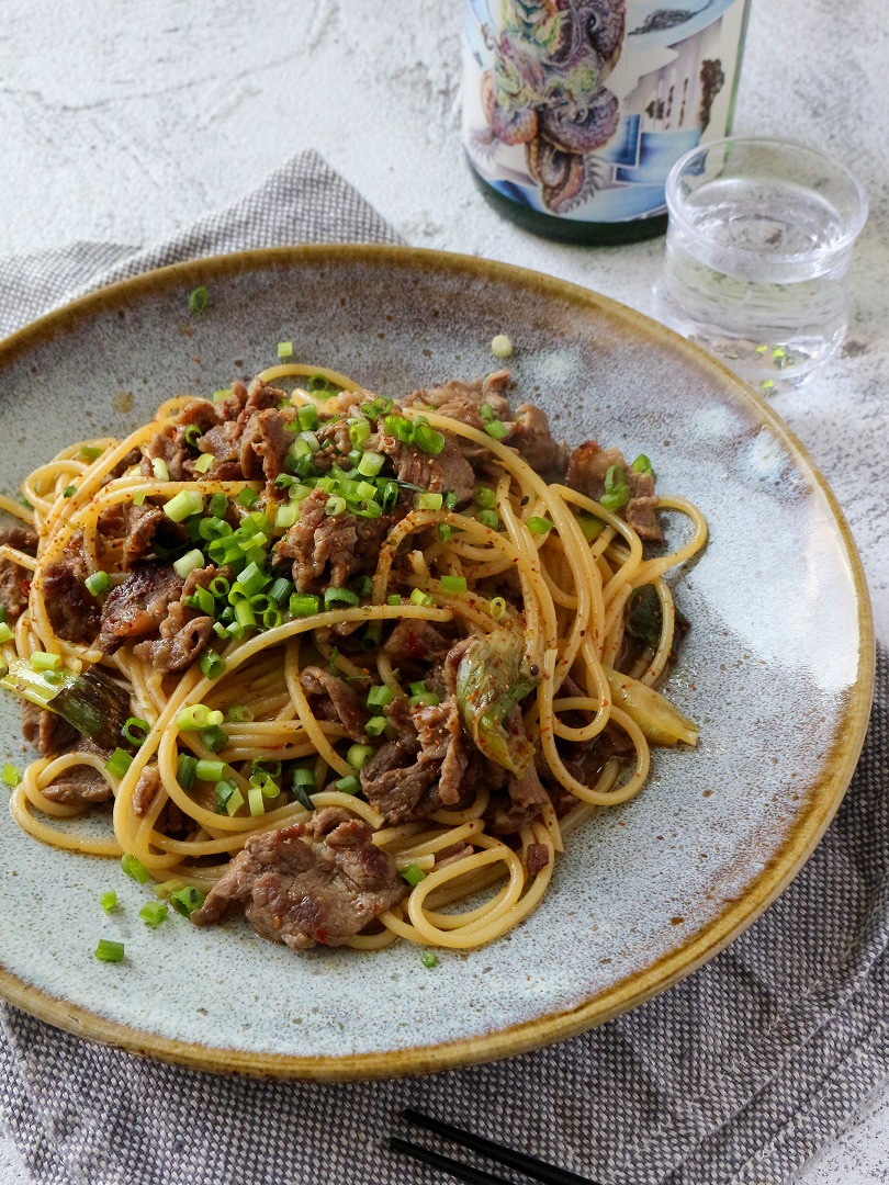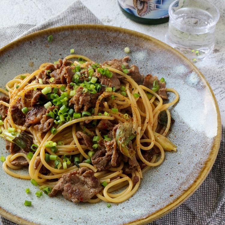 というわけで、今回は忙しい年末にもぴったり! 年末年始に自宅にあるであろう食材で「牛肉とねぎの柚子胡椒パスタ」を日本酒と合わせてご紹介します。