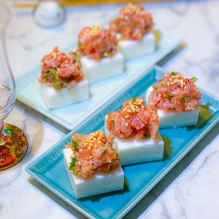 ふんわり軽いはんぺんに、まぐろのたたきをのせた一口サイズのおつまみ。大葉や生姜の香りが爽やかで、さっぱりといただけます。