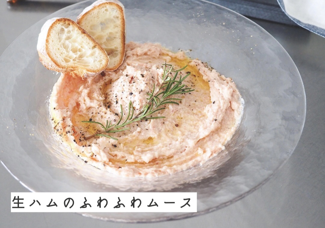 こちらは、生ハムの芳醇な香りと塩気を、生クリームで贅沢にまとめたふわふわムースのレシピです。作り方は、とってもシンプル。一口大にちぎった生ハムと調味料をフードプロセッサーで細かく攪拌し、さらに生クリームを加えて再度混ぜ合わせるだけ!