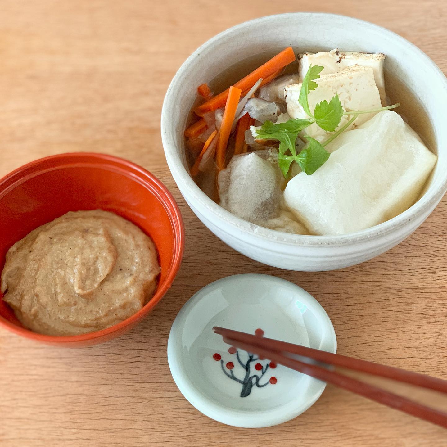 岩手のお雑煮「くるみ雑煮」は、醤油ベースのすまし汁で、具材は角餅とたっぷりの根菜や凍り豆腐などが入ります。お餅はそのまま食べても良いのですが、甘じょっぱい“くるみだれ”につけて食べるのが定番です。