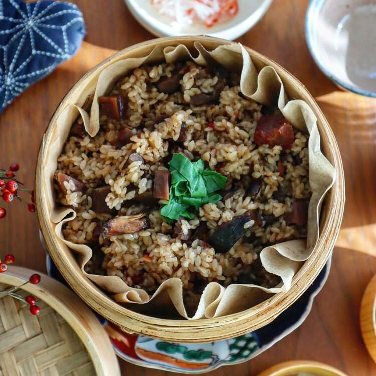 @chieko_tanabe_さんは何ならこの「中華おこわ」を作るために、筑前煮を多めに作っているそう。筑前煮ともち米をごま油で炒めてオイスターソースと中華出汁(顆粒)を加えて炒め合わせたら、蒸籠で40分ほど蒸せば完成。