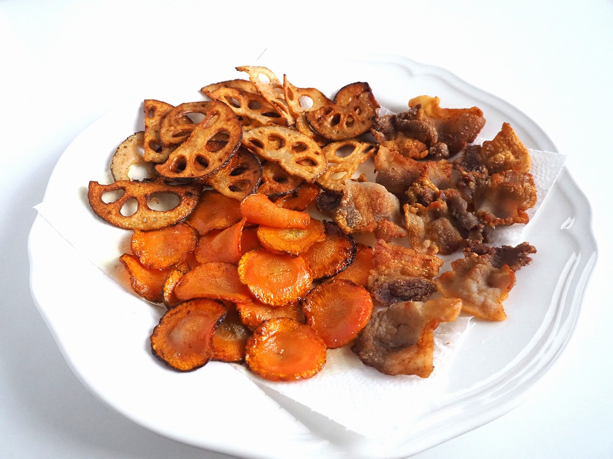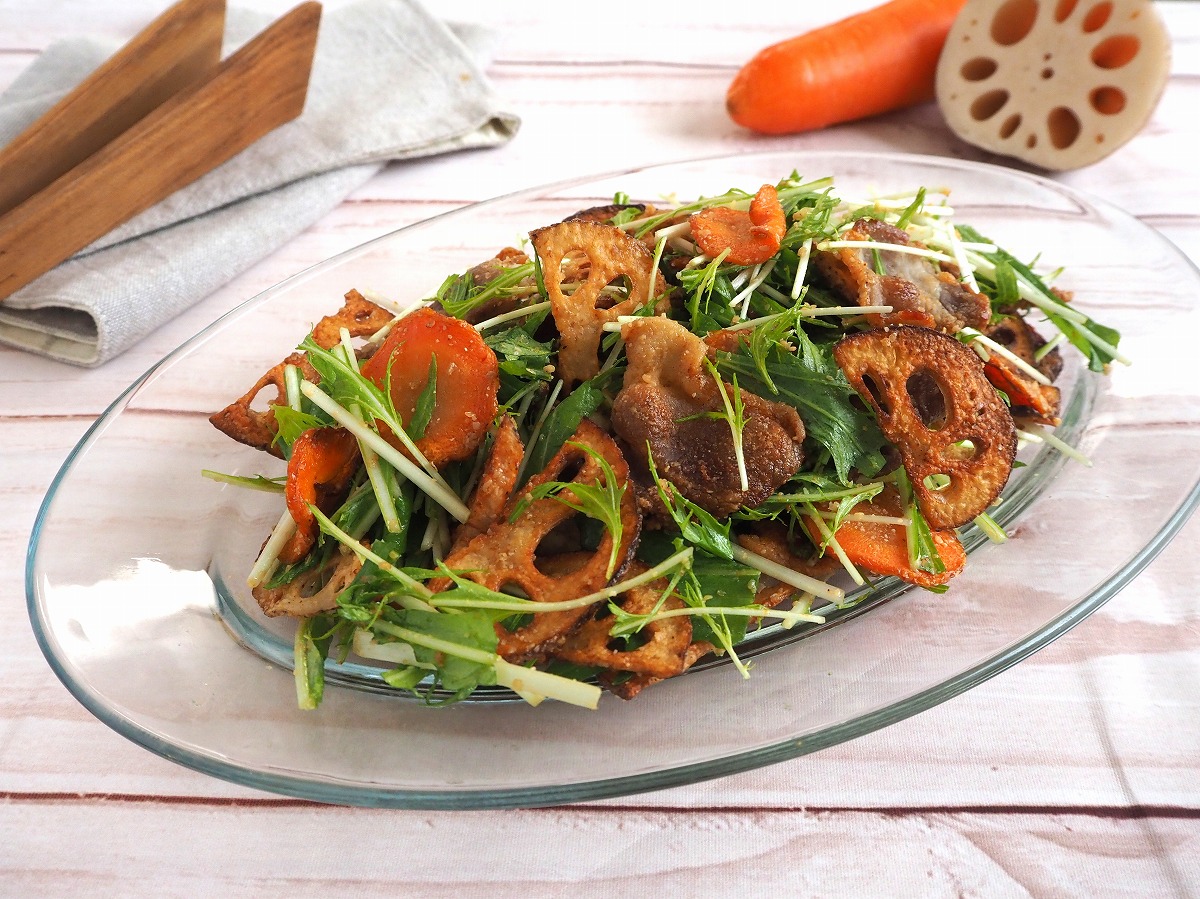このサラダのポイントは、豚バラ肉をカリッカリに焼き、その際に出た脂を活用して蓮根と人参を焼くこと。豚肉の旨みがお野菜にもしっかりと絡みます。