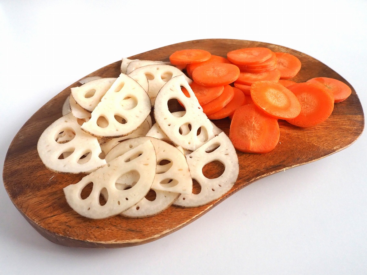 2. にんじんと蓮根は皮付きのまま薄く輪切りにする(大きければ半月切りにする)。