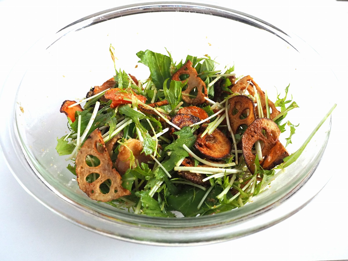 水菜と一緒に濃厚でコクのあるごま味噌だれで全体を和えたら、ごちそう感たっぷりなデリサラダの完成です♪