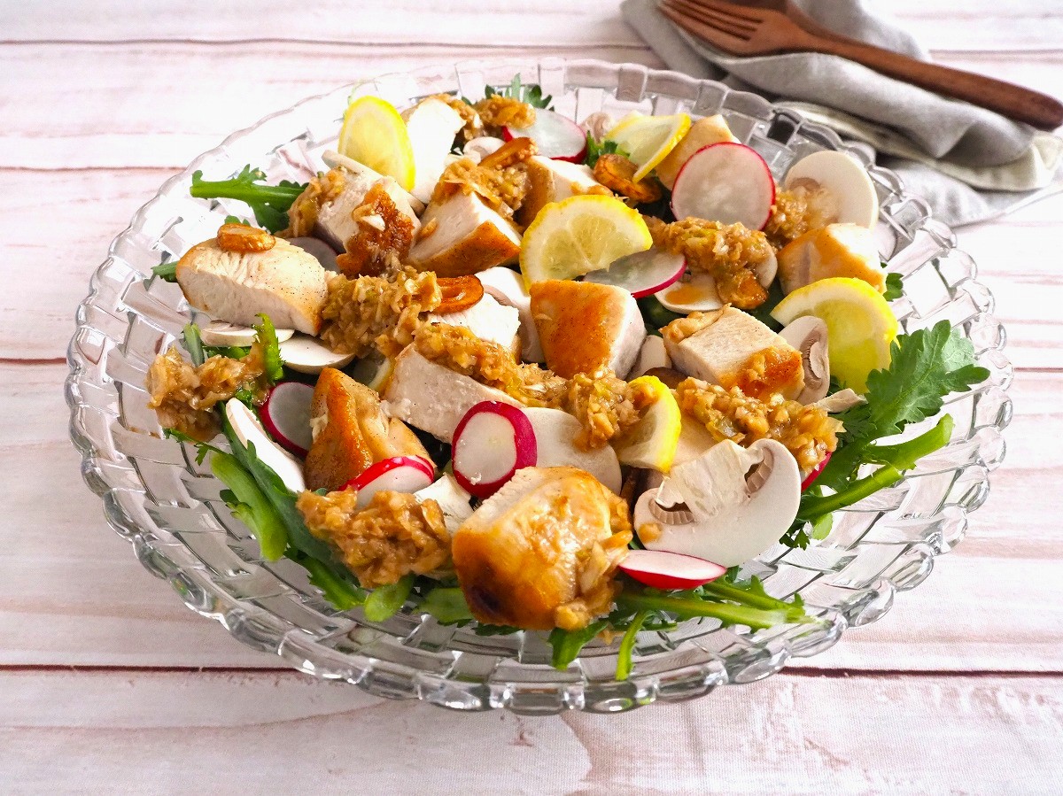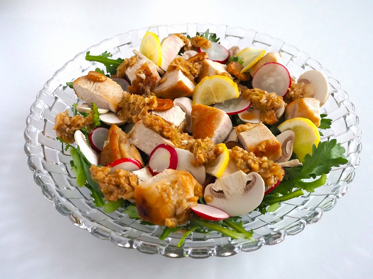 5. 器に春菊を広げ、その上にマッシュルーム、ラディッシュ、3の鶏むね肉、にんにくチップを器に盛り付ける。香味だれをたっぷりかける。