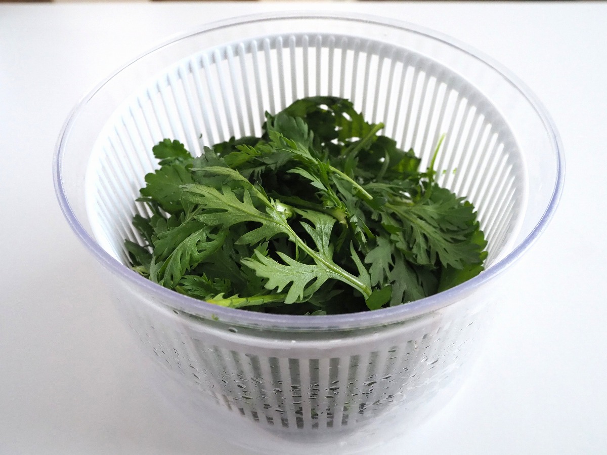 1. 春菊は葉と軸に分ける。軸は斜め1cm幅に切る。水にさらしてからよく水気を切る。